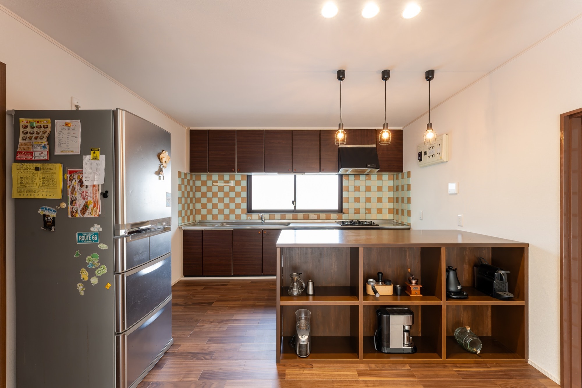 こちらのお家は少し前にキッチンをリフォームされていたそうで、「今あるキッチンはまだ新しいのでそのまま活用したい。だけど作業スペースや収納が足りず、それはどうにか解消したい」といったお悩みをお持ちでした。そこで、手前の棚を新たに大工さんに造作してもらいました!お気に入りのコーヒーグッズをすっきりと収納できるジャストサイズ。床やキッチンの色味に合わせたダークブラウンカラーが格好いいですね♪