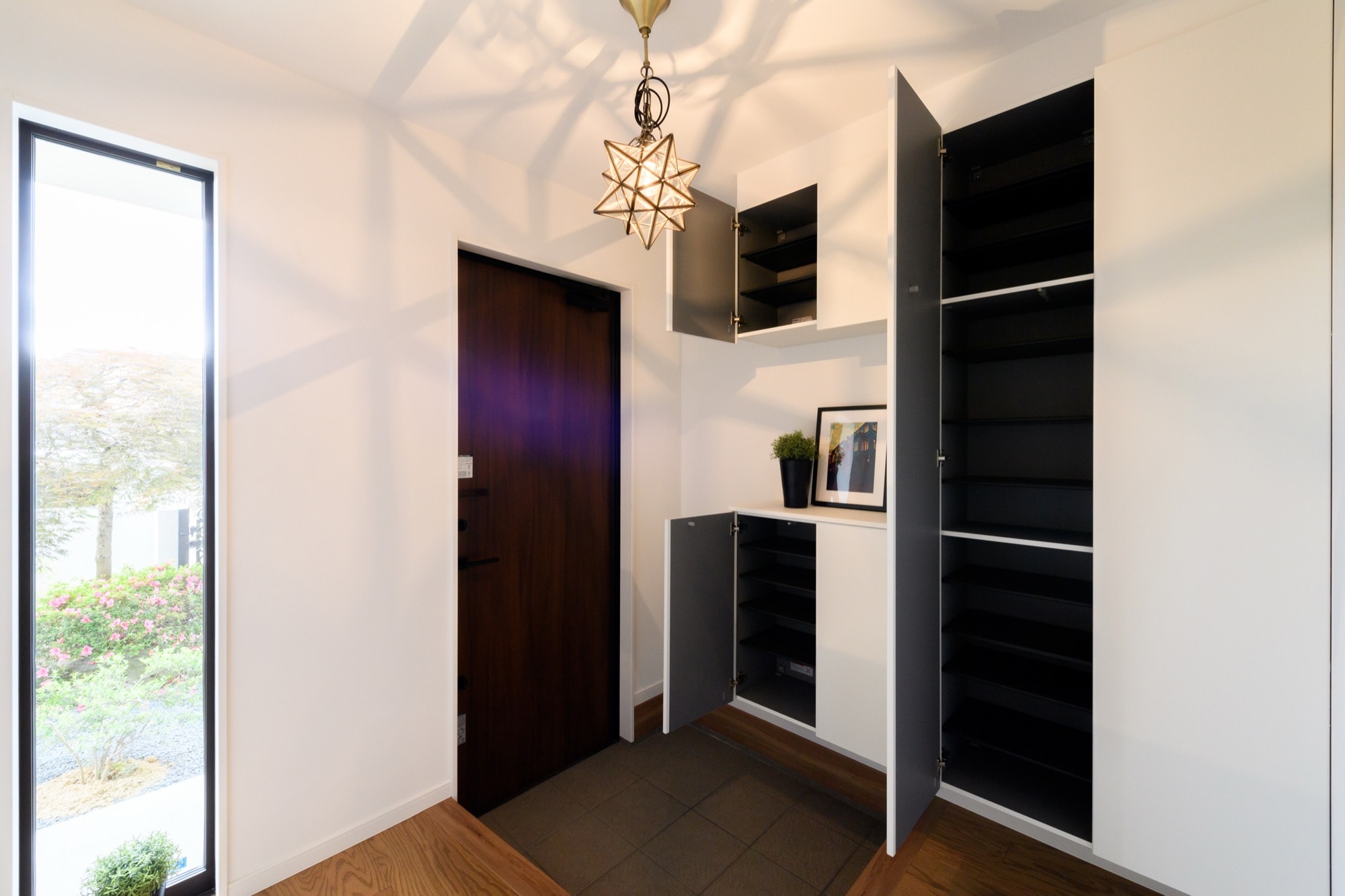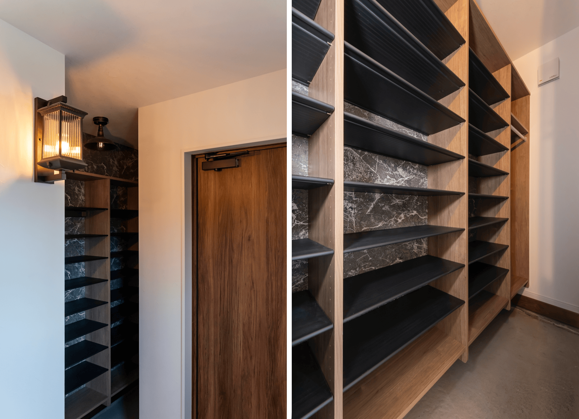 8段の可動棚3つとハンガーバー付きの棚をつくり、2世帯分の靴類を無理なく収納していただけるようにしました。