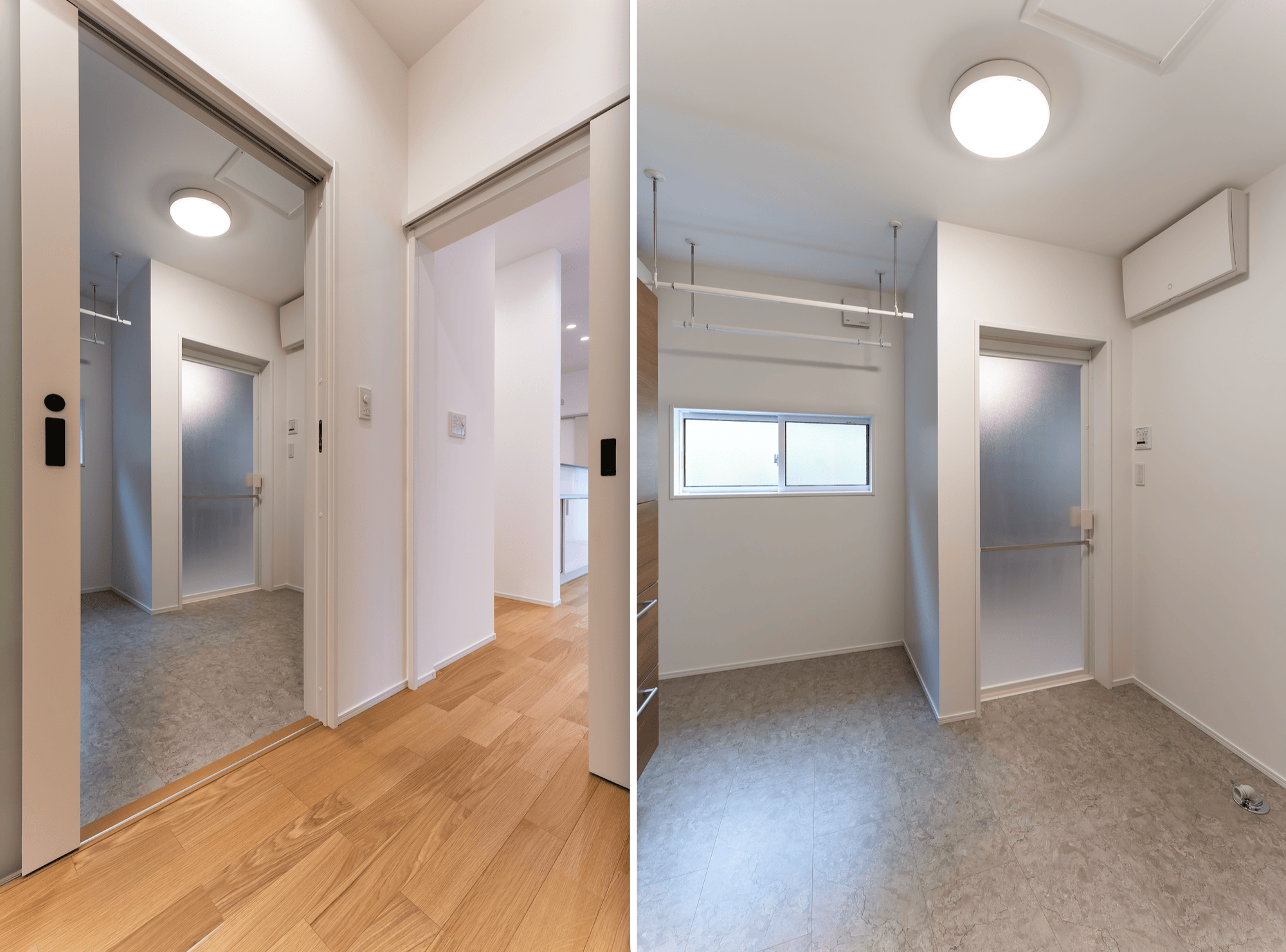 ここに干して乾いた洗濯物は、速やかに向かいの引き戸付き収納へ。
