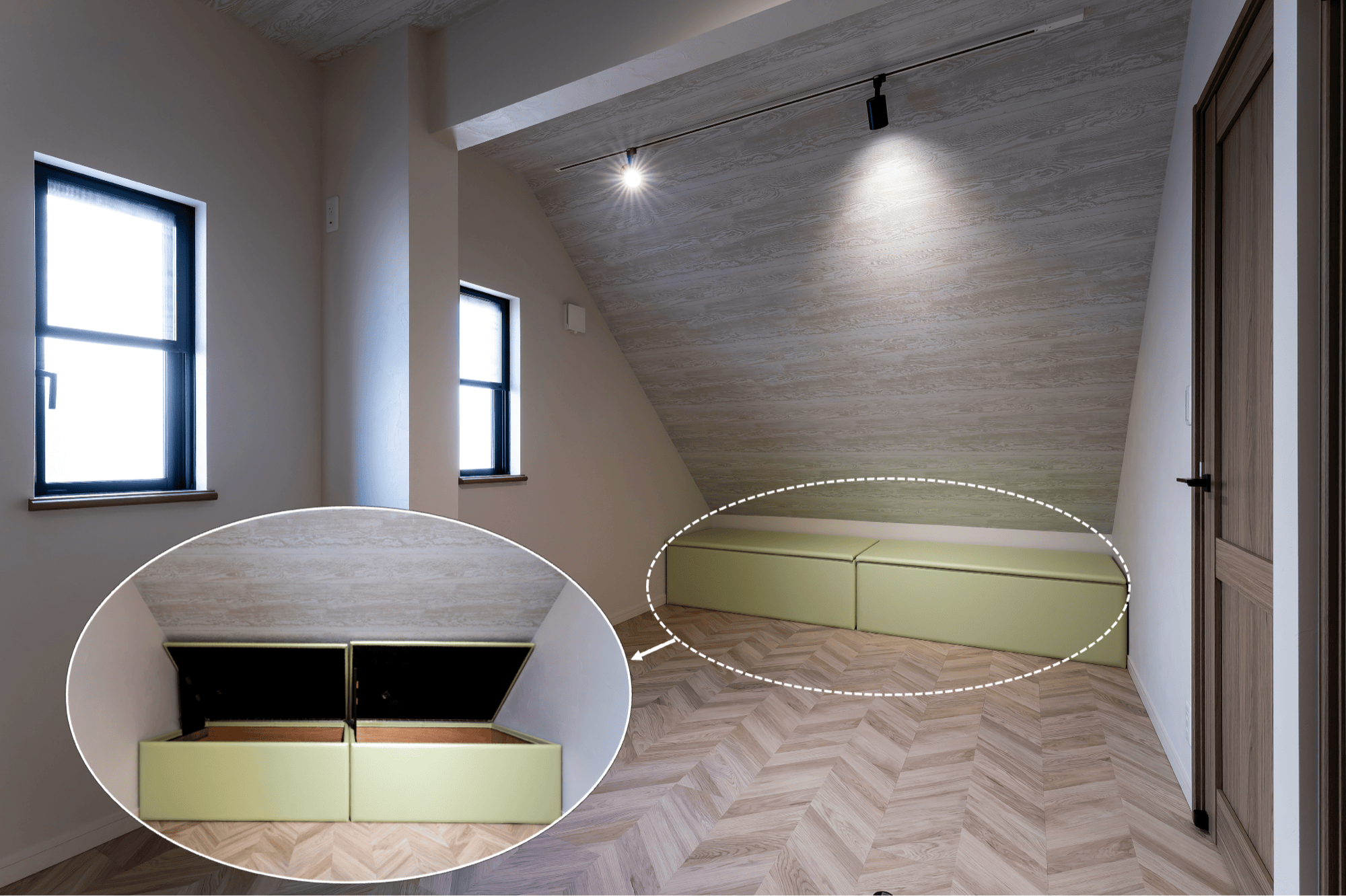 こちらは勾配天井の隅に設置した、寝具を入れるための収納ボックスです。