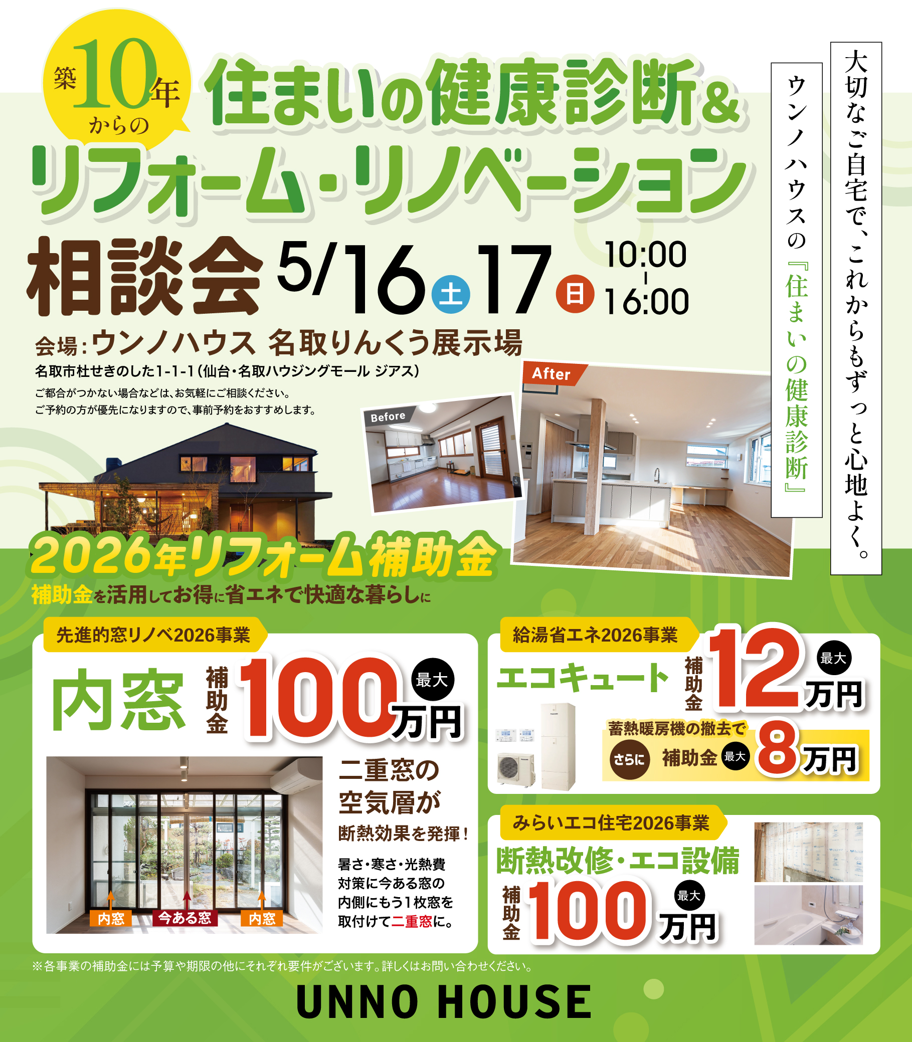 大切なご自宅で、これからもずっと心地よく。ウンノハウスの「住まいの健康診断」&リフォーム・リノベーション相談会【名取りんくう展示場】
