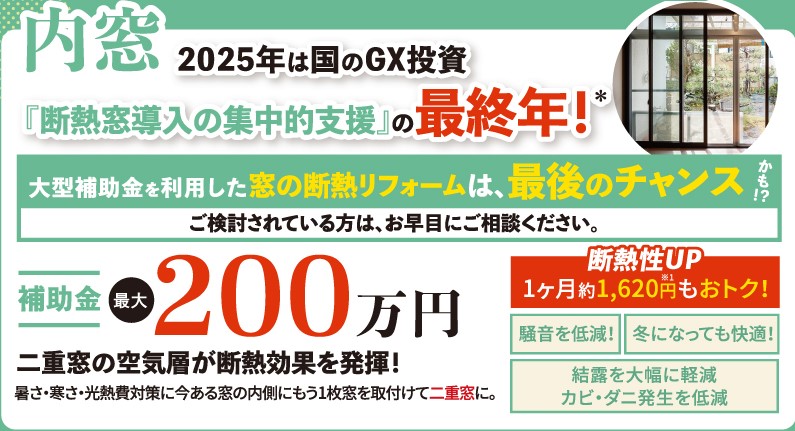 国のGX投資「断熱窓導入の集中的支援」の最終年となる予定です。 大型補助金を利用した窓の断熱リフォームは、最後のチャンスかもしれません!窓リフォームを検討されている方は、お早目にご相談ください。