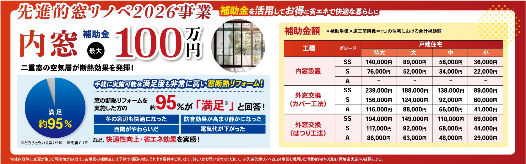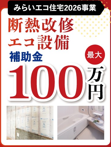 断熱窓への改修、躯体の断熱改修、エコ住宅設備の設置などを対象とし、改修前後の省エネ性能に応じて最大100万円の補助金が受けられます。