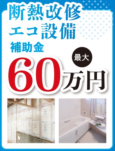 断熱窓への改修、躯体の断熱改修、エコ住宅設備の設置などを対象とし、最大60万円の補助金が受けられます。