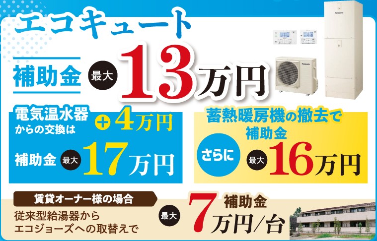 対象機種により6万円~13万円までの補助金が受けられ、さらに電気温水器と蓄熱暖房機の撤去に対する加算もあり、2024年も大変注目度の高かった制度です。